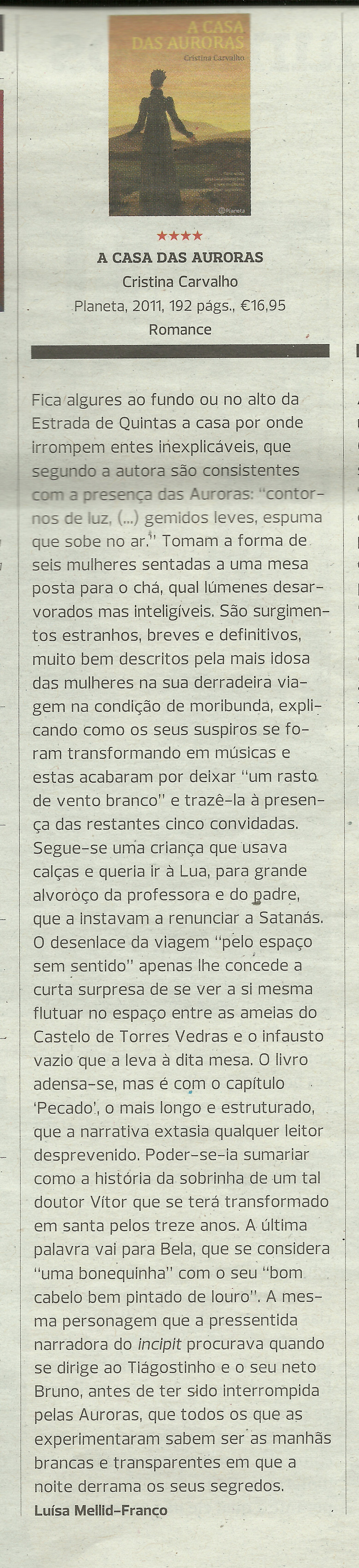 Surge agora, em 2011, com esta obra, A Casa das Auroras. Um objecto surpreendente, poderei mesmo chamar-lhe, de alguma forma, inclassificável, pois oscila entre vários registos narrativos. É aí que a autora concentra toda a originalidade da sua nova obra, transformando-a num híbrido, do ponto de vista narrativo. Não é romance, mas também não é conto, ou é, antes, ambas as coisas e ao mesmo tempo. Trata-se de uma opção arriscada, a de fazer oscilar a estrutura narrativa tradicional. Mas é, também, uma forma de encantar, de seduzir o leitor, através dos mecanismos lúdicos da escrita. E o manancial de Cristina Carvalho é vasto. Uma escrita viva e ágil, escorreita, a capacidade (hoje rara) de bem contar uma história, transportando a imaginação do leitor através dos meandros quase labirínticos até ao desvendar final (furto-me a pormenores, para não destruir o interesse), o sentido de humor subtil e permanente.